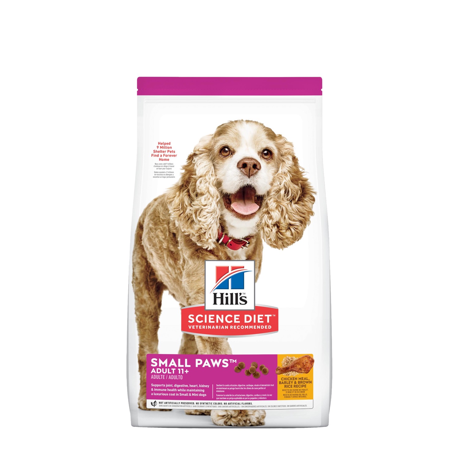 As small-breed dogs get older, their nutrition needs change. Hill's Science Diet Small Paws Adult 11+ dry dog food is tailored nutrition to support healthy aging during small & mini dogs’ golden years. The small kibble is specially made with prebiotic fiber to help your little, older dog's digestion, while the omega-3 fatty acids from fish oil promote joint health. This senior dog food uses a balanced set of minerals to support a healthy heart, healthy kidneys, and a healthy bladder in toy breed dogs, while the omega-6s and vitamin E nourish the skin and coat. Since immune health is so vital for older dogs, this pet food made with natural ingredients uses a special blend of antioxidants to promote lifelong health. There’s more to love with the new look of Science Diet. Some of our products also have new names, new kibble shapes & new formulas.