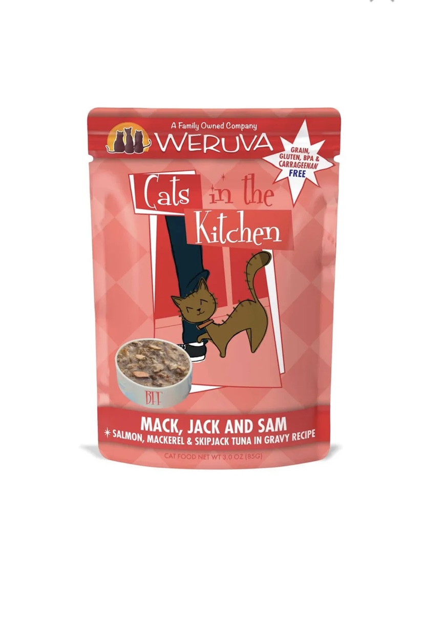 Weruva Cats in the Kitchen - Mack, Jack and Sam Wet Cat Food mixes wild-caught salmon, mackerel, and skipjack tuna into a smooth gravy sauce that completes this delicious meal. If your cat is a sea food lover, this wet cat food is a must-try! Each pouch contains moisture that is essential to your cat's diet and it is also free of grains, gluten, and carrageenan. Filled with protein, omega 3 & 6, vitamins, and taurine, making each pouch a deliciously balanced and complete meal that your cat is sure to love!